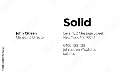 Solid-CardFront-90mmx55mm A minimalist business card features "Solid" in bold black, right, with contact details below; "John Citizen" and title left, all on white.