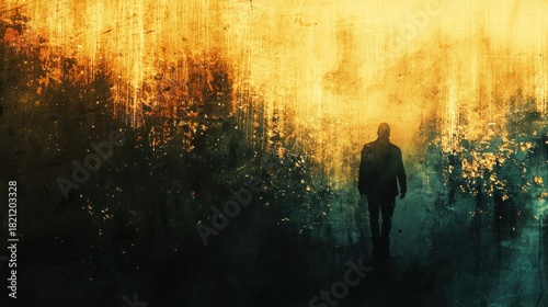 Solitary Figure Walking Towards Light in Abstract Landscape.