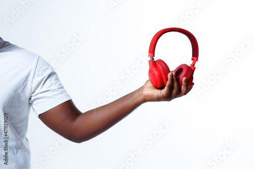 Somebody is showing cool red headphones in his hand.