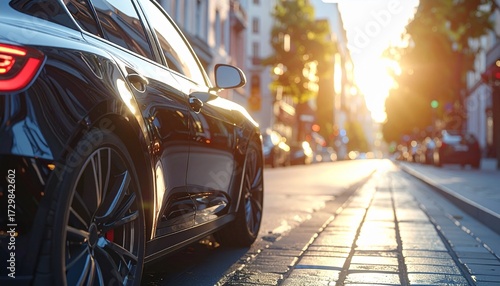 Sophisticated black vehicle parked on a sun-drenched city street during a warm, golden sunset, embodying urban automotive luxury