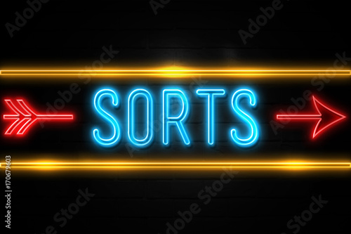 Sorts - fluorescent Neon Sign on brickwall Front view