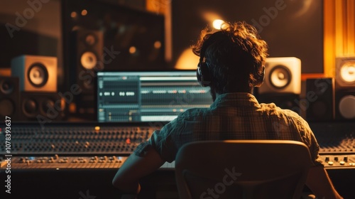 Sound engineer in recording studio diverse team clean layout soft lighting