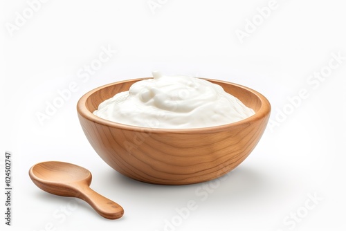 sour cream in wooden bowl and spoon, mayonnaise, yogurt, isolated on white background, clipping path, full depth of field