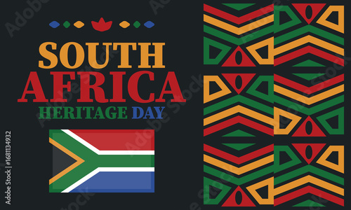 South Africa Heritage Day. Happy holiday. Celebrate culture and traditions of nation. South African flag. Poster with illustration. Pattern design. Vector