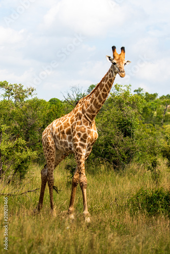 South African giraffe (Giraffa, G. camelopardalis) Family of giraffes standing on a hill in the thick lowveld, Pilanesberg National Park, Kalahari and lowveld, South Africa