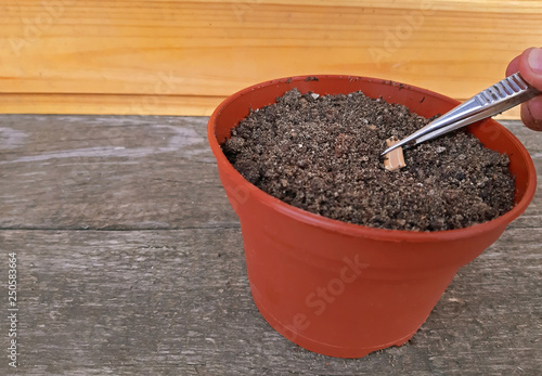 Sowing a seed in potting soil with Copy space