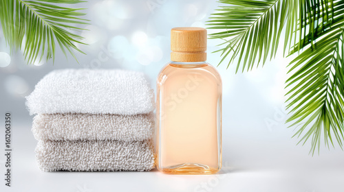 Spa Setting with Amber Lotion Bottle and Towels