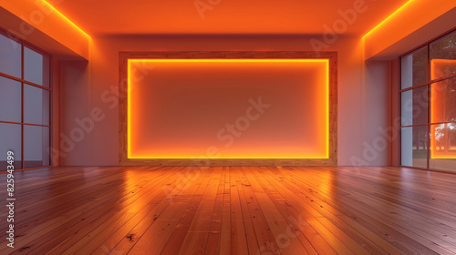 Spacious room with a wooden floor and a blank wooden frame lit by an orange light border.