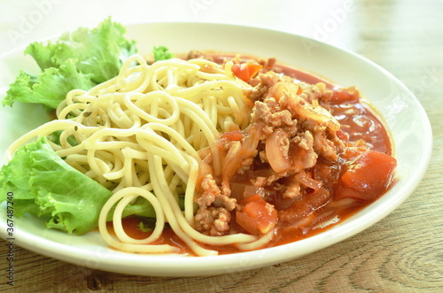 spaghetti dressing fried chop pork and slice tomato in ketchup sauce on plate