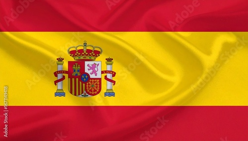 Spanish national flag with red-yellow-red horizontal stripes and detailed coat of arms on the hoist side, symbolizing Spain’s monarchy and historical kingdoms.