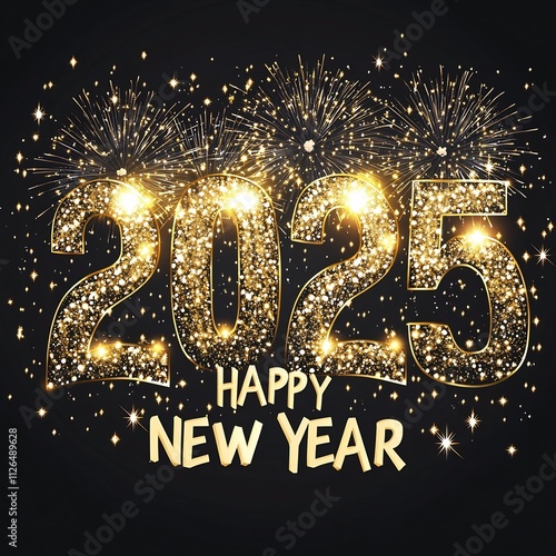 Sparkling 2025 Fireworks and Festive Happy New Year Banner on Black Background