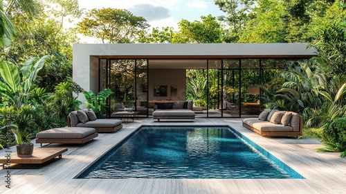 Sparkling blue swimming pool concept. Modern house with a pool surrounded by lush greenery and stylish seating.