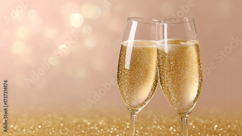 Sparkling champagne glasses clinking together, creating festive atmosphere with glittering background. This captures joy of celebration and special moments