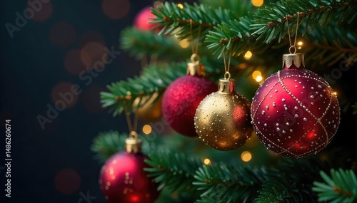 Sparkling Christmas tree ornaments on a decorated branch , conifer, purple, holiday