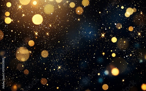 Sparkling golden and blue bokeh lights on black background.