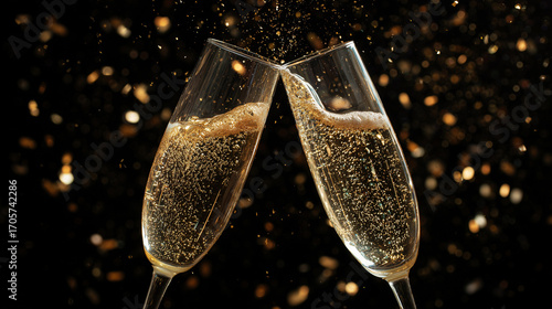 Sparkling New Year Celebration Concept, Champagne Glasses Clinking, Golden Confetti, Black Background, Elegant Luxury Style, Festive Party Atmosphere