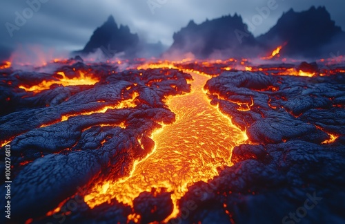 Spectacular close-up of lava flowing from an active volcano in Iceland at dusk, showcasing bright red and orange hues against dark landscapes