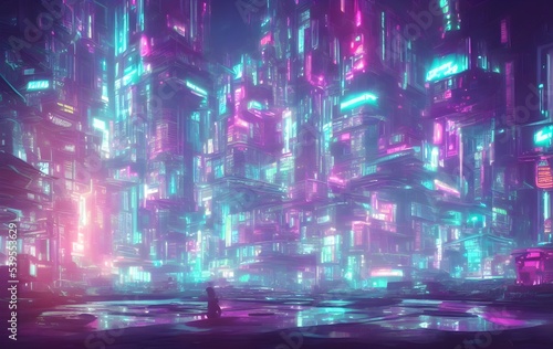 Spectacular nighttime in cyberpunk city of the futuristic fantasy world features skyscrapers, flying cars, and neon lights. Digital art 3D illustration. Acrylic painting.