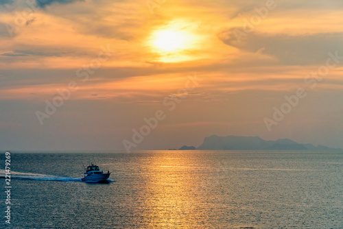 Speedboat for fishing on the sea returning to shore during the sunset in the midst of nature and the beautiful sky.