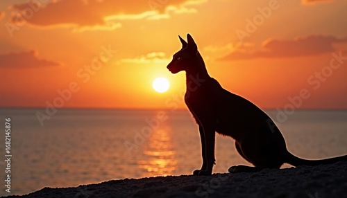 sphinx cat silhouette against a stunning sunset over the ocean horizon at a beach