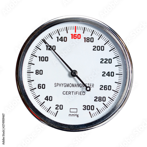 Sphygmomanometer closeup macro, blood pressure measurment medical equipment. Tonometer, medical tool isolated on white background in high resolution.