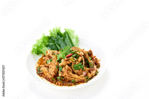 Spicy grilled pork neck salad served with fresh vegetable