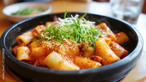 Spicy korean rice cake dish with vegetables and sesame in a black bowl