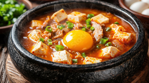 Spicy Korean Stew with Tofu and Egg Served in Traditional Stone Bowl