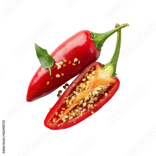Spicy Red Jalape�o Peppers with Seeds and Basil Leaf, Isolated on Black Background