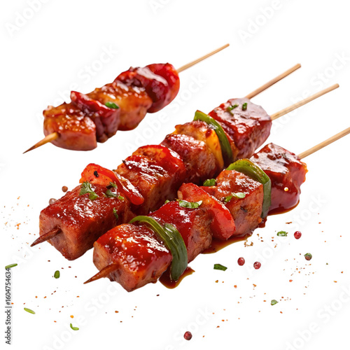 Spicy Street Food Skewers with Red Glaze Isolated on White Background
