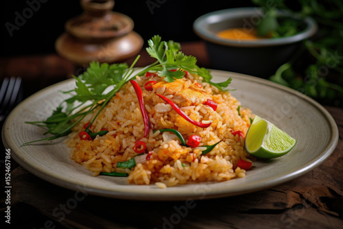 Spicy Thai style one dish meal Fried rice with canned tuna served on a white plate