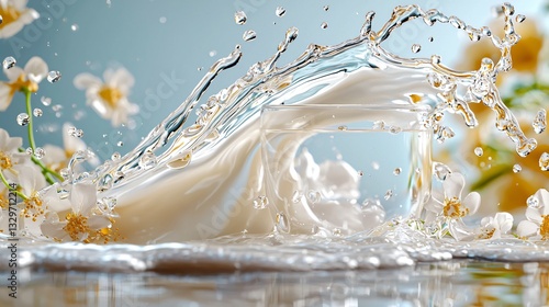 Splash of Water with Cream and White Flowers on Soft Blue Background Capturing Beauty and Freshness
