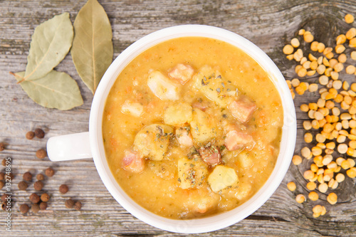 Split pea soup, decorated with some bay leaves, marjoram and peas