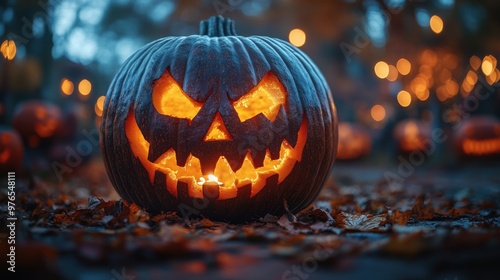 Spooky Carved Pumpkin Illuminated by Candlelight in Autumn Setting with Halloween Decorations in Background
