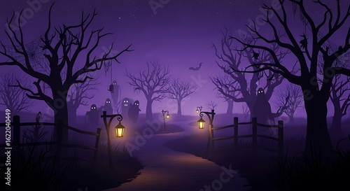 Spooky Halloween Forest Path with Ghostly Trees and Glowing Lanterns at Night
