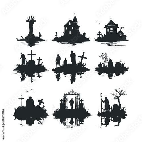Spooky Halloween graveyard scenes for creative design projects. Halloween vector illustration