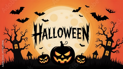 Spooky halloween night scene with jack o lanterns and bats flying around a full moon