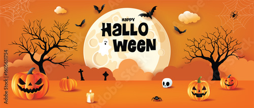Spooky Halloween Party Banner with Pumpkins and Full Moon