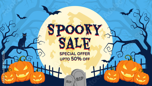 Spooky Halloween social media banner with bats, pumpkins, and ghosts. Designed for Instagram, Facebook, TikTok, Pinterest ads.