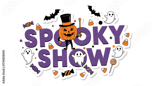 Spooky Show: a vibrant illustration that encapsulates the whimsical spirit of Halloween, adorned with playful ghosts, candy and a charming pumpkin character.