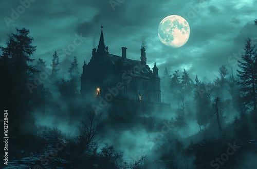Spooky Victorian mansion on a hill under a full moon and fog house building