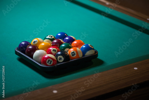 Sport billiard balls set and a chalk in a box on green billiard table in pub. Players are ready for the round to start the billiard game