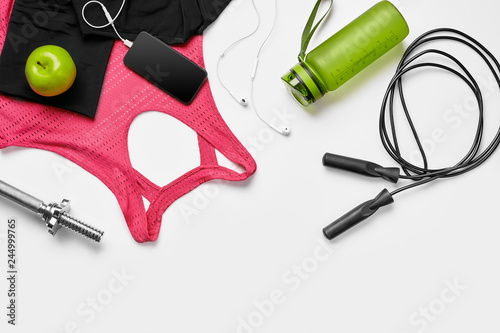 Sport, fitness, healthy lifestyle, cardio training and objects concept - close up of female sports clothing, skipping rope and bottle set