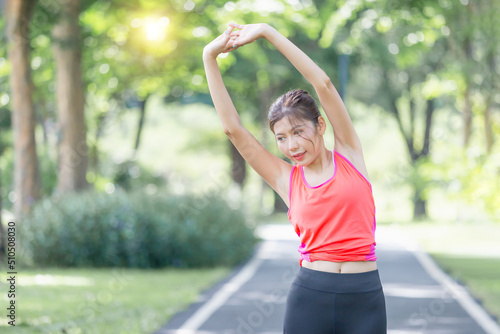 Sport woman warming up outdoors, Fitness woman doing stretch exercise stretching her arms