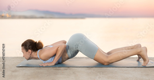 Sportive woman performing cobra pose of yoga during training on beach at sunrise outdoors