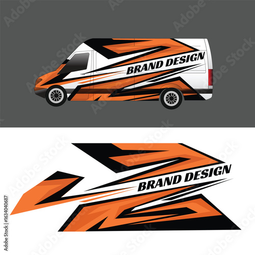 Sporty and modern van livery decal design featuring bold orange, black, and white geometric graphics with sharp, dynamic lines