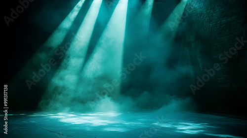 Spotlight casting a beam on a stage with soft, billowing teal smoke, giving a tranquil, underwater feel
