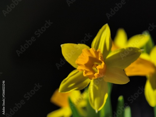 Spring background. Beautiful colorful daffodils or narcissus close-up in morning light. Amaryllidaceae. Yellow daffodils in spring, daffodils in the garden. Daffodils symbol of easter.