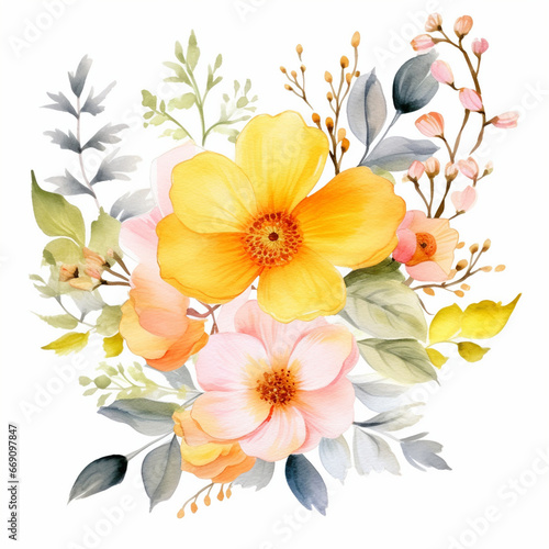 Spring bright flowers and leaves watercolor paint for card decor on white. Generated AI