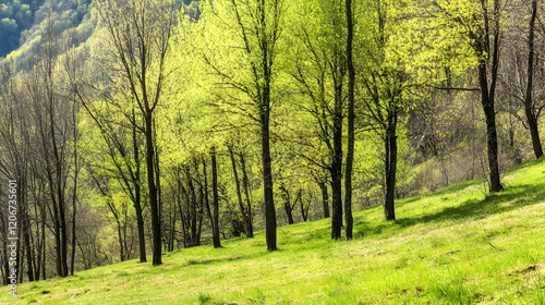 Spring hillside forest, lush green grass, sunlight dappling through new leaves, peaceful nature scene, ideal for nature documentaries